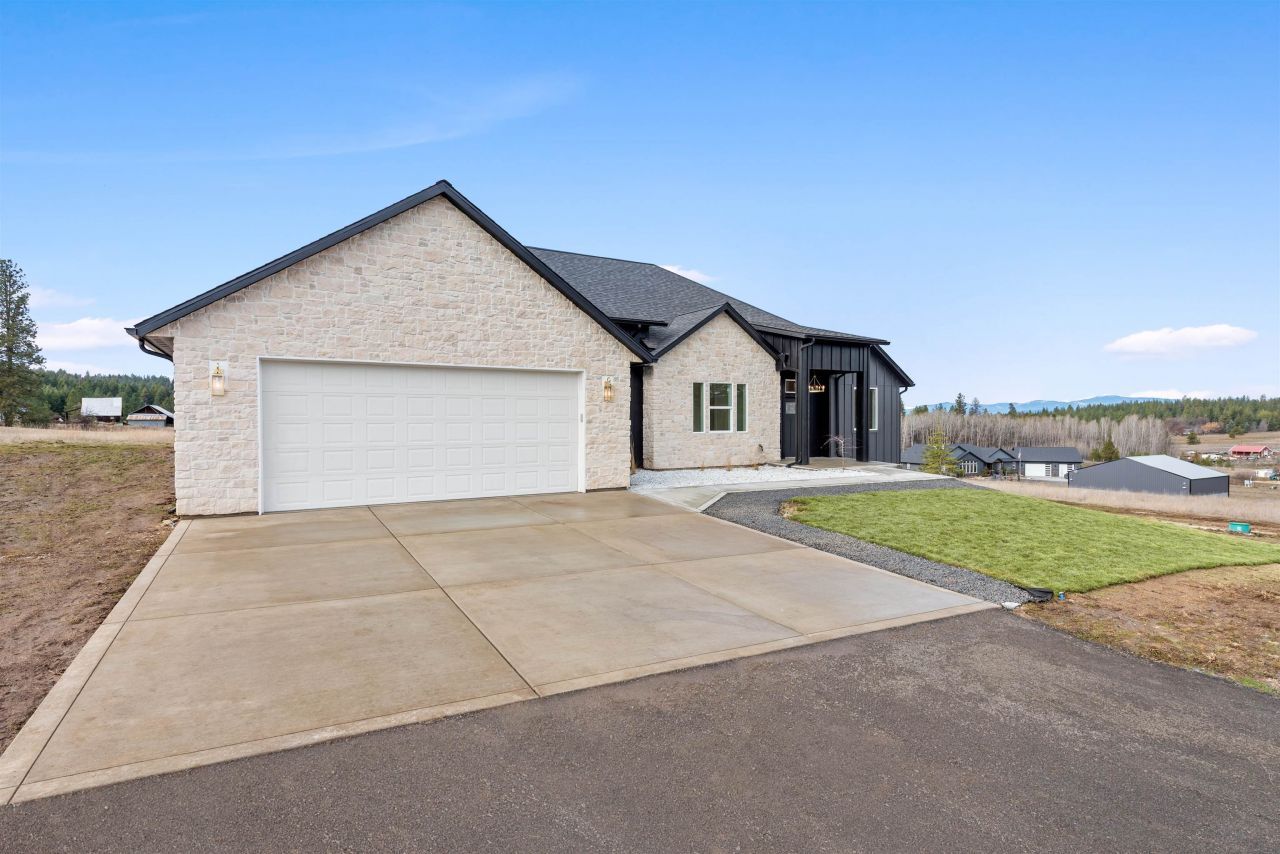 Home! This brand new home is a custom once in a life time opportunity! Modern craftsmanship with 10.5 spacious acres and panoramic Mt. Spokane views in this new build by Maximus Homes. Approach the stone-accented exterior to find a seamless zero-step entry leading into 2,374 sq/ft of convenient, single-level living. As you step inside, the stunning, design unfolds through elegant arched doorways and a great room coffered ceiling, creating an atmosphere of timeless grandeur. The two-tone kitchen with its stunning surfaces and brushed gold fixtures, complemented by a butlers pantry with a grocery door, and spacious dining that extends to the covered back deck. The master suite is your own personal wellness center, featuring a luxury tiled bath with walk-in rain head shower, sauna and a custom California-style closet. This home also boasts its own spacious office room and guest bedrooms, finished with an expansive laundry and wet room that adds exceptional storage. Dont miss this stunning home!